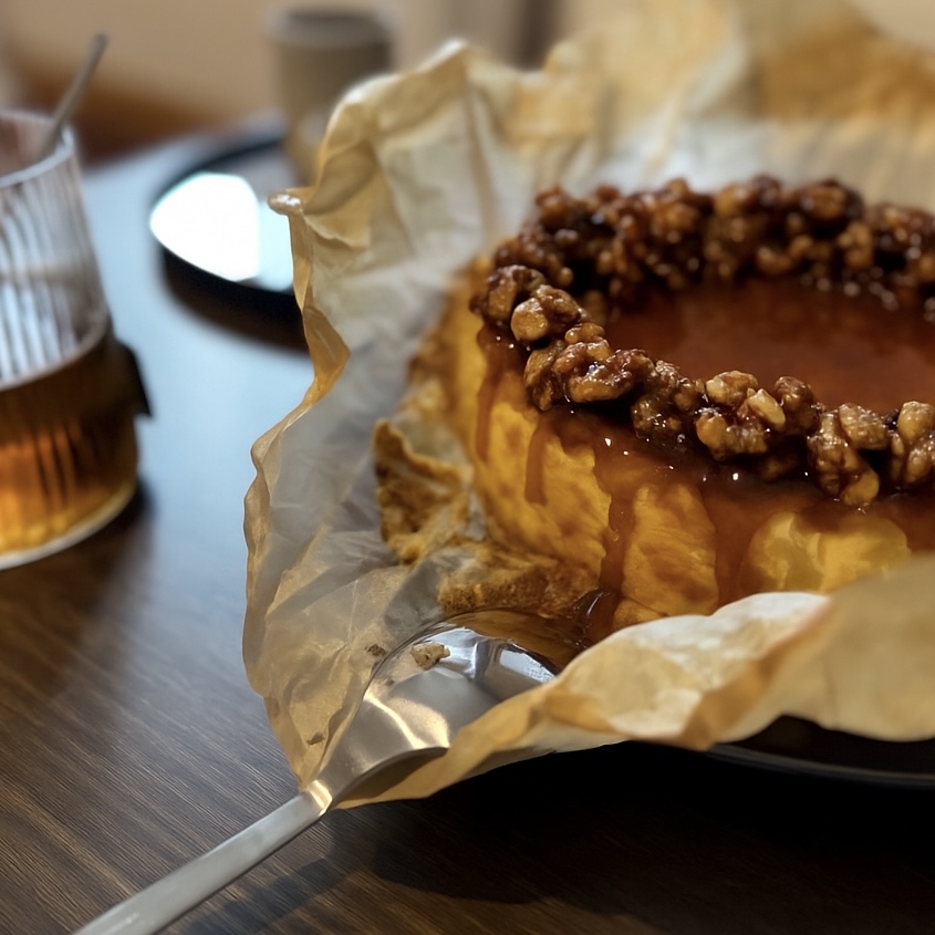 Nuestra tarta tradicional está coronada con una capa de nueces caramelizadas que aportan un contraste dulce y ligeramente tostado, con un toque de caramelo que se funde con cada bocado.